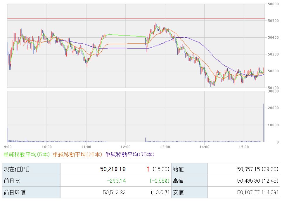 293円下落した、50,219円で本日の取引が