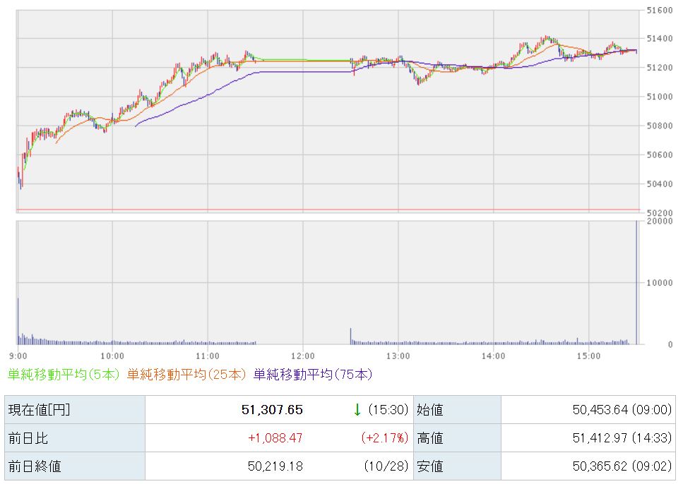 日経で約2.2%上昇、TOPIXで約0.2%下落、