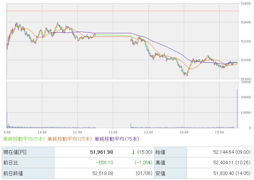 51,961円で本日の取引が終了しました。