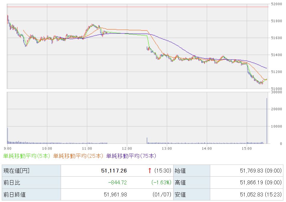51,117円で本日の取引が終了しました。