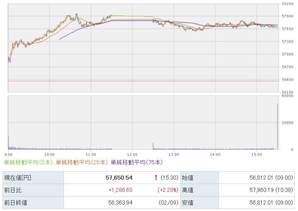 上昇した、57,650円で本日の取引が