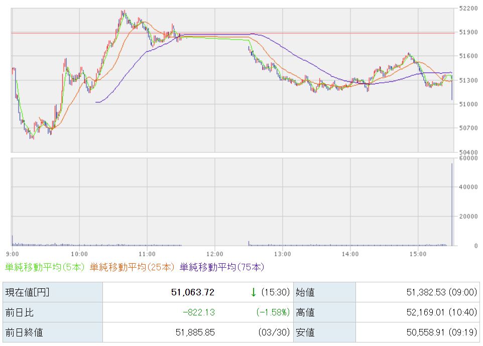 日経225は、前日終値が51,885.85円で始値が