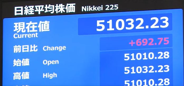 【速報】日経平均株価 年始の取引は670円の値上がりでスタート 5万1000円を回復 一時1400円以上値上がり
