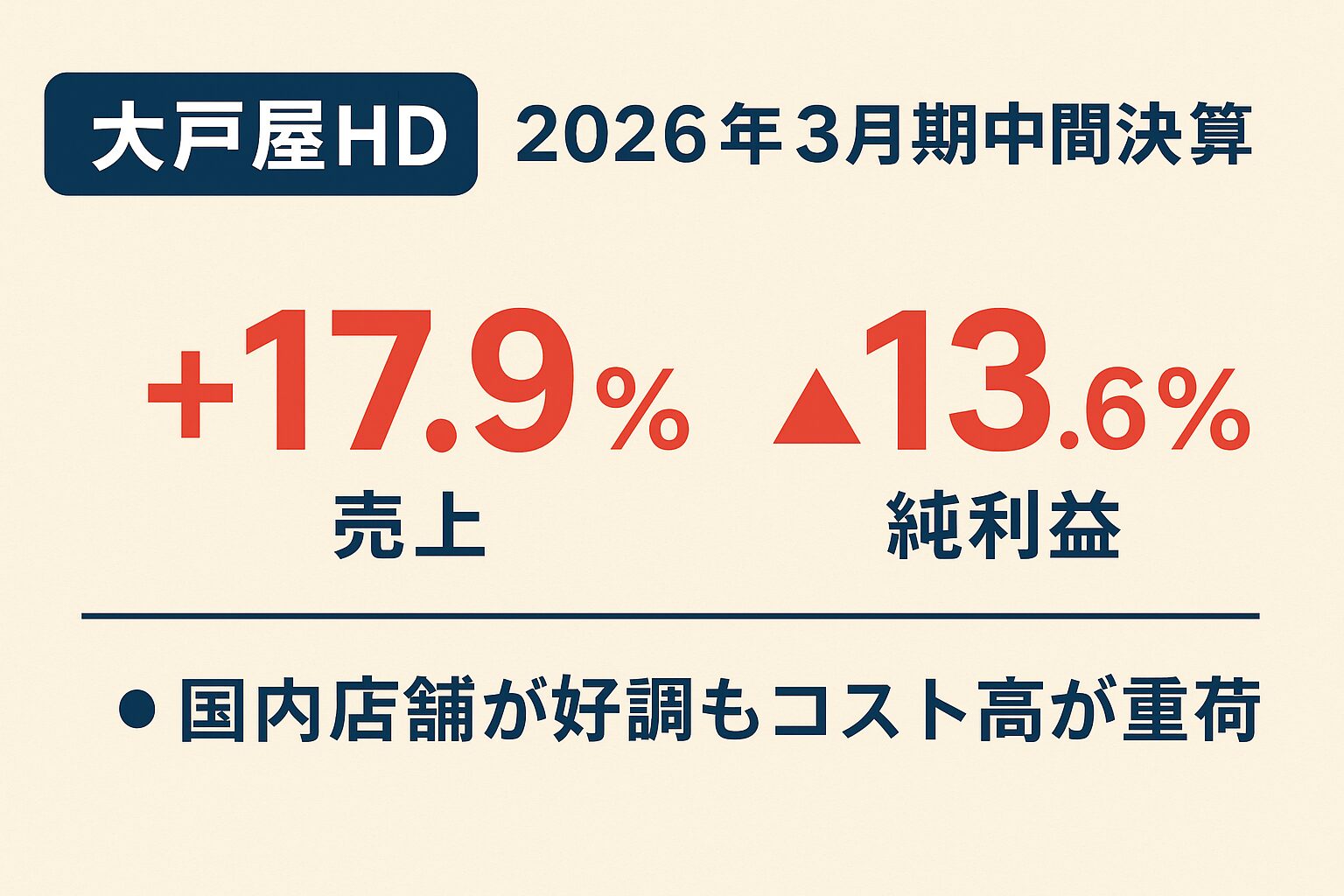 【2705 大戸屋HD】売上+17.9%で増収も純利益▲13.6% 国内店舗好調もコスト高が重荷【2026年3月期2Q決算】