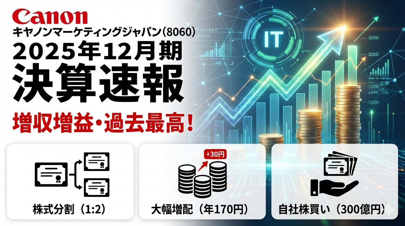 キヤノンマーケティングジャパン株式会社(8060)の2025年12月期決算が発表されました。ITソリューション事業の成長を背景に、売上・利益ともに過去最高を更新。さらに株式分割や大幅増配など、投資家にとってポジティブな材料が揃っています。重要ポイントを簡潔にまとめました。