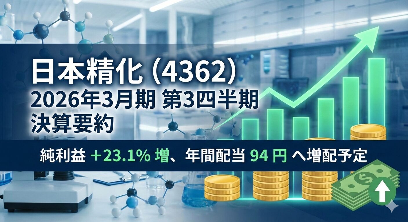 日本精化株式会社(4362)から、2026年3月期 第3四半期の決算短信が発表されました。売上高は商事子会社の除外により減収となったものの、利益面ではファインケミカルの収益改善や投資有価証券売却益により、親会社株主に帰属する四半期純利益が前年同期比23.1%増と力強い数字を見せています