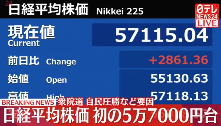 東京株式市場で日経平均株価が急騰し、初の5万7000円台をつけました。