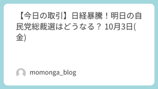 今日の日経 【今日の取引】日経暴騰!明日の自民党総裁選はどうなる? 10月3日(金) 明日、自民党総裁選があり前日のお祭り感があるのでポジション整理を行いました。どっちに転んでもいいようにするという、テスタさん教えが一番いい。 2025.10.03 今日の日経