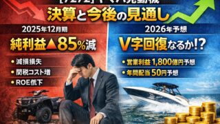 ヤマハ発動機(7272)の2025年12月期決算を徹底解説。純利益▲85%減の理由、マリン・OLV事業の動向、2026年業績予想、株価の今後と配当方針まで投資家目線で分かりやすくまとめました。