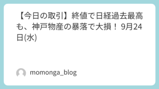 今日の日経 【今日の取引】終値で日経過去最高も、神戸物産の暴落で大損! 9月24日(水) 神戸物産の暴落。本当に死んだ。日経は今日も上昇してくれるけど、個別銘柄は本当にダメ。 2025.09.24 今日の日経
