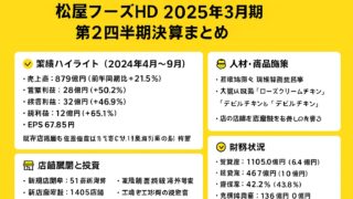 日記 松屋フーズホールディングス(9887)の決算を解説|2025年3月期2Qは増収増益 【決算速報】松屋フーズHD(9887)売上+21%・純利益+65%の大幅増益🔥既存店売上112%&新規出店効果で好調継続。通期も増収増益を予想💪 2025.11.09 日記